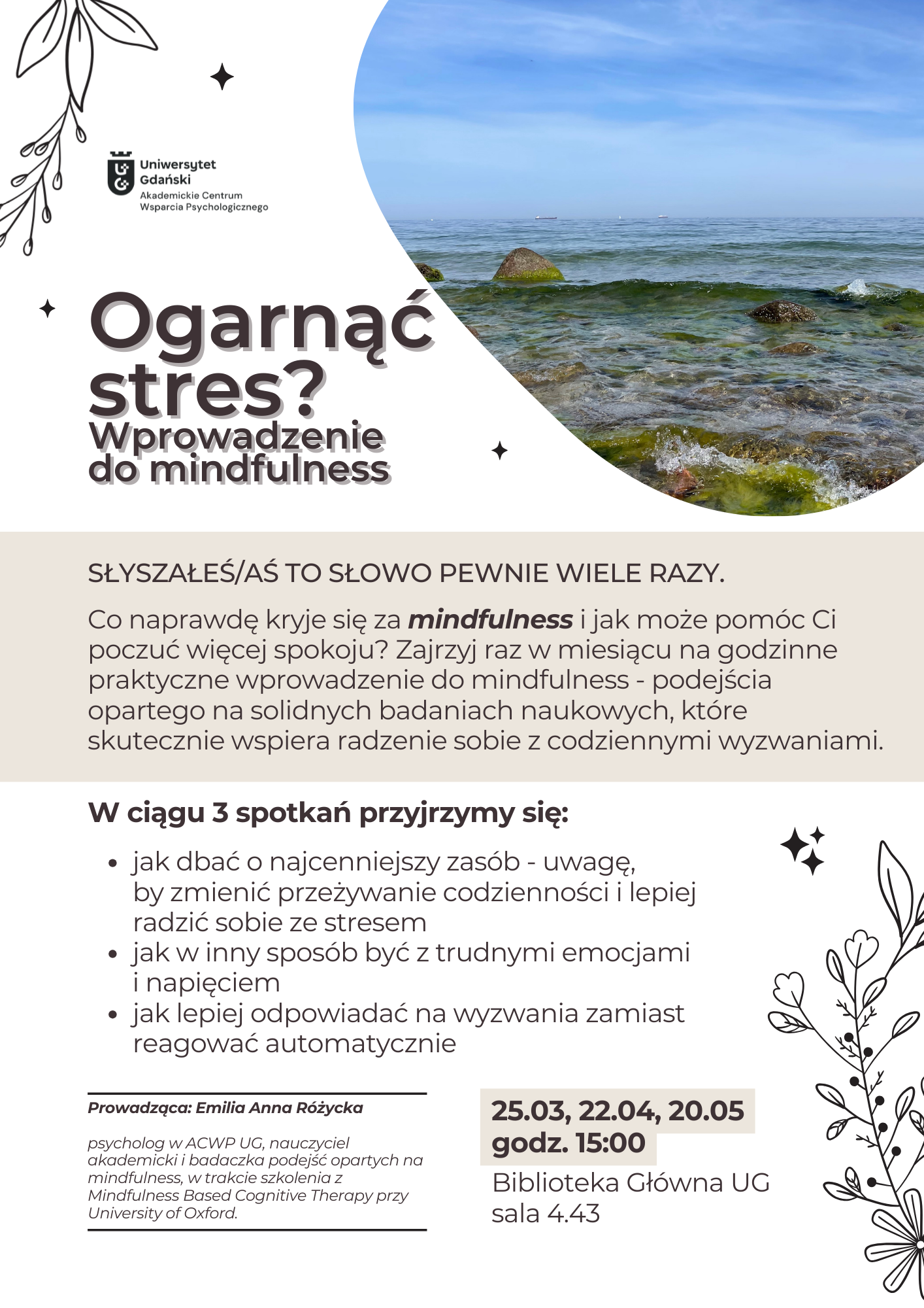 Prowadząca: Emilia Anna Różycka — psycholog w Akademickim Centrum Wsparcia Psychologicznego UG, nauczyciel akademicki i badacz podejść opartych na mindfulness, w trakcie szkolenia z Mindfulness Based Cognitive Therapy przy University of Oxford.